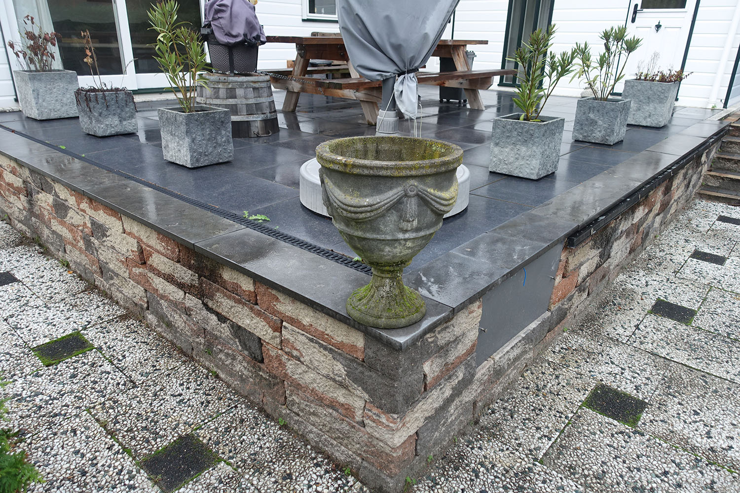 Aan de achterzijde van het chalet staan twee afsluitbaar tuinhuisjes 2×2 mtr. deels ingegraven en voorzien van elektra en 1×2 mtr. voor fietsen. Hier zit ook de buitenkraan en er ligt een druppelslang in de border. Verder is hier genoeg ruimte om te klussen of voor een 2e terras. Het feitelijke verhoogde terras ligt aan de voorzijde, hier staat een ruime picknicktafel. In de opgehoogde muur zit verlichting. Vanaf het terras aan de voorzijde kijk je uit op de tuin met vijvertje, terwijl in de border langs de eigen parkeerplaats en oprit ook nog appelbomen staan. Aan het chalet zit een ruime overstek wat het ramen wassen scheelt. Hier hangen ook twee bewakingscamera’s.