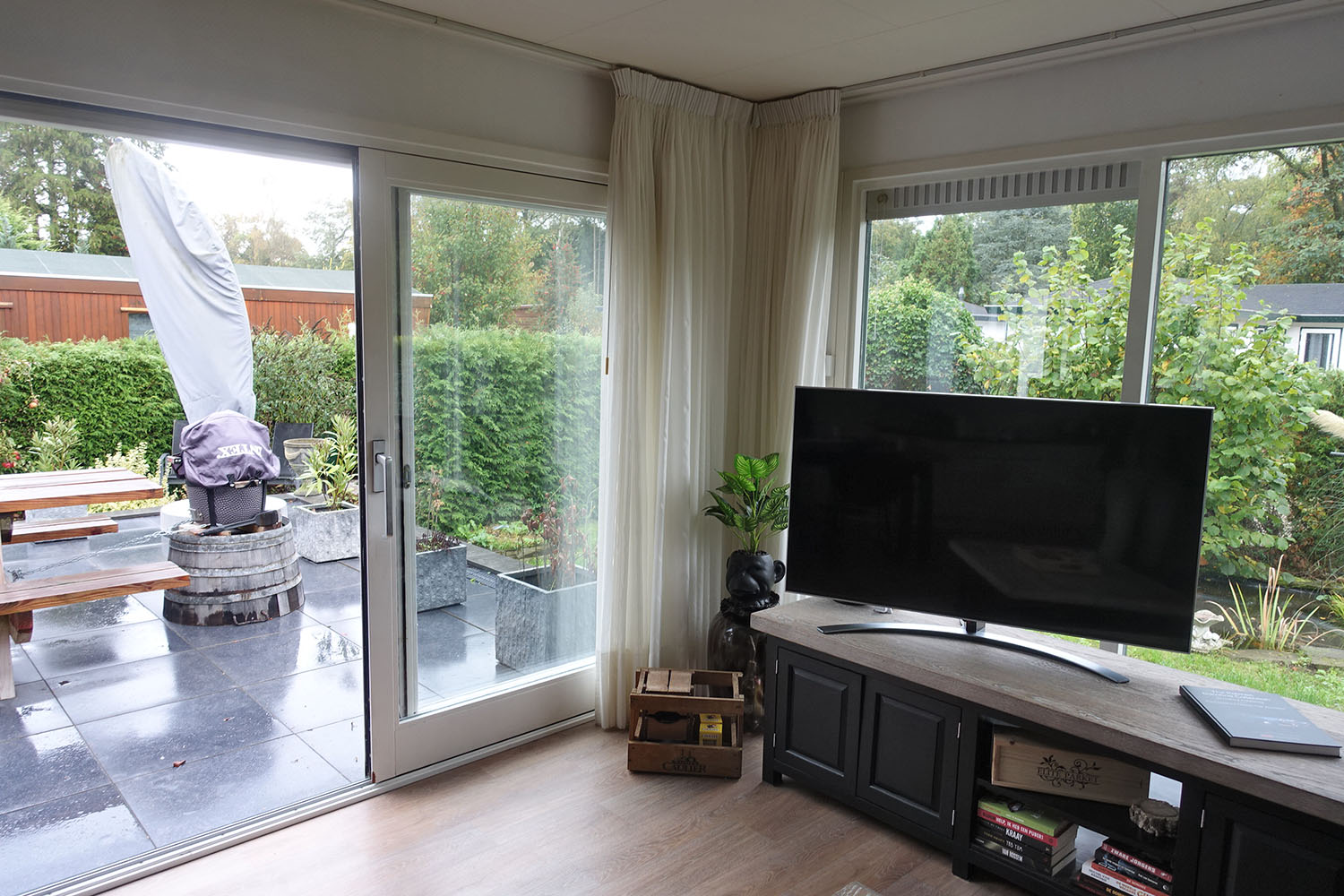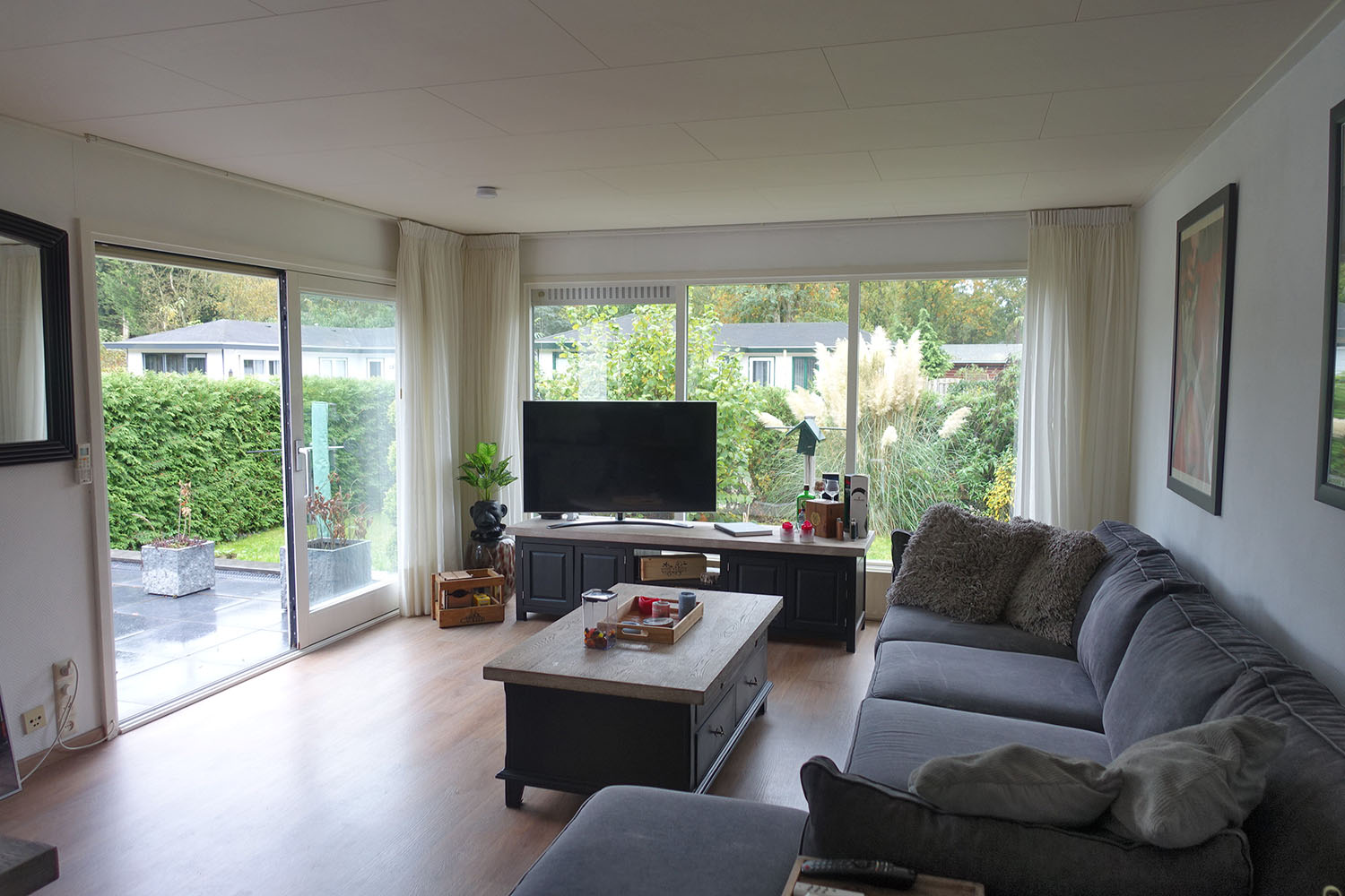 Een ruime lichte woonkamer met grote ramen aan de voorzijde, uitkijkend op de tuin en aan de zijkant een schuifpui om direct het terras op te stappen. Een L-vorm chalet van 63m2 met een zee aan ruimte, 2 slaapkamers, berging, badkamer, keuken en woonkamer. Rondom tuin, aan twee zijden terras en omringt met coniferen.