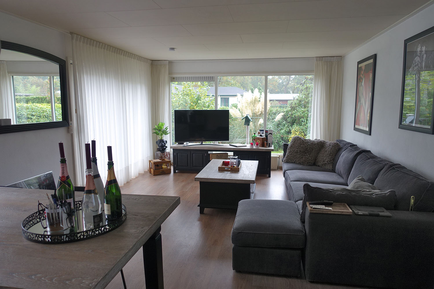 Grote ramen en lichte kleuren maken de woonkamer zeer ruimtelijk. De kleuren zijn heel basic gehouden; vinyl in licht eiken kleur dat goed past bij het meubilair. De schuifpui geeft direct toegang tot het terras.