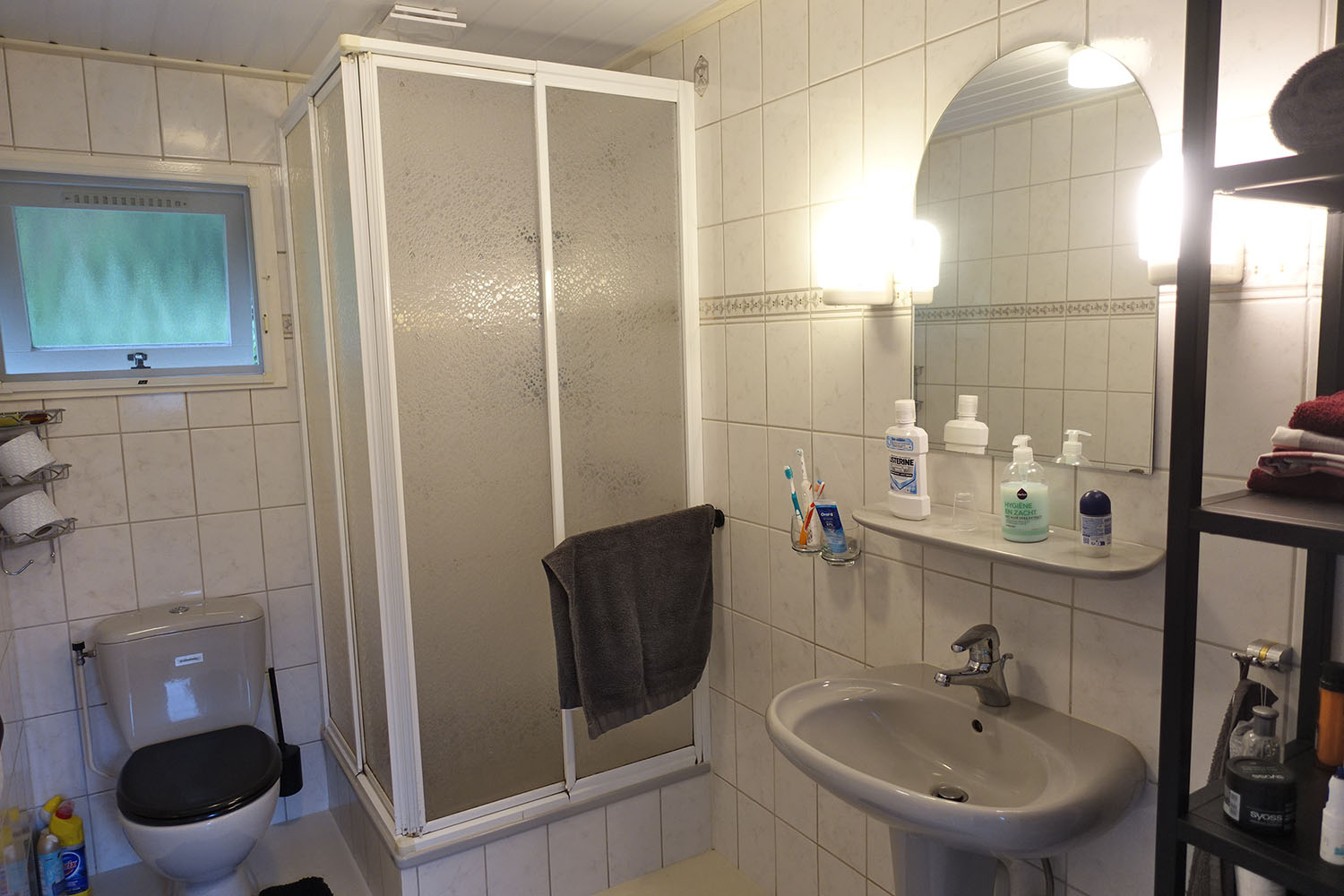De badkamer is misschien wat gedateerd, maar wel ruim 1.65×2.90. De douchecabine meet 80×80, verder is er een wastafel met spiegel, een bergmeubel, het toilet en een radiator. Een raam en een mechanische afzuiging. In de berging gelijk bij binnenkomst, staat een vrij nieuwe extra grote koelkast, en tevens, ook nieuw de wasmachine en droger.